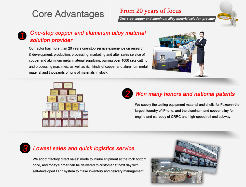 Factory history: Founded in 1998, JFCA is one of the largest domestic wholesalers of Custom and Standard Copper and Aluminum processing material. Our nearly 300,000 square feet of distribution and manufacturing space is continually stocked with over eighteen million pounds of inventory. As one national high-tech enterprise by passed ISO9001:2008,we continues to satisfy customers with all kinds of technical problem......